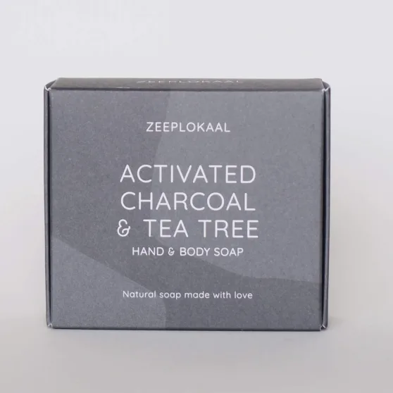 Zeep met zwarte actieve kool en etherische tea tree olie is sterk reinigend. Zwarte actieve kool bindt zich aan de vetten en vuiligheid op je huid. Schrik niet van het zwarte sop dat de zeep afgeeft! Dit spoel je zo weer weg en het blijft natuurlijk niet zichtbaar op je huid. Etherische tea tree olie staat ook bekend om zijn zuiverende eigenschappen en heeft een fijne geur die ons aan een dagje in de sauna doet denken.