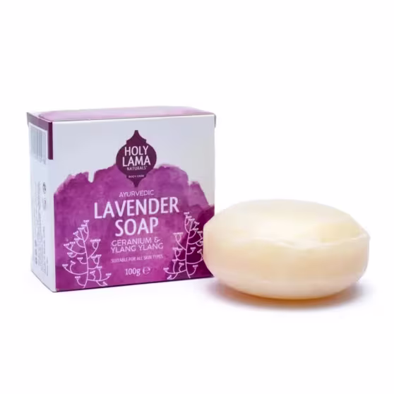 Holy Lama Naturals Lavendel Zeep met geranium en ylang ylang is een opwekkende zeep die het lichaam op een natuurlijke manier verzorgt.
