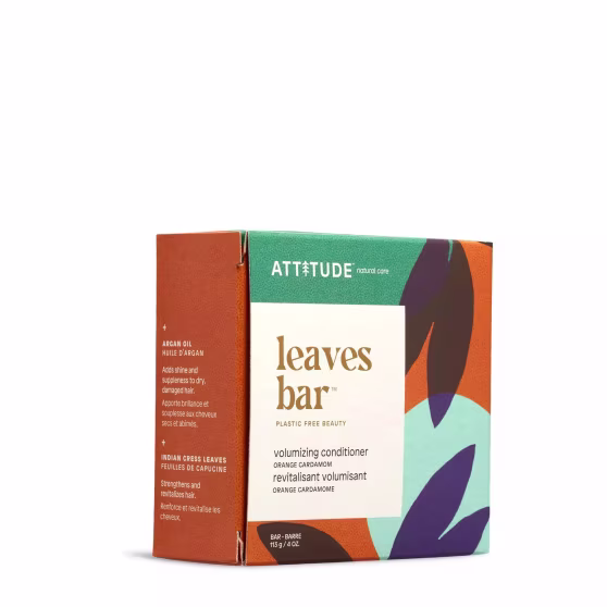 Versterk en conditioneer je haar en zorg tegelijkertijd voor het milieu met onze nieuwe plasticvrije ATTITUDE Leaves bar™ Volumizing Conditioner bar - Oranje kardemom. Het bevat veel punch en goed voor je haar ingrediënten en super bladeren zoals Indiase tuinkers, waterkers, evenals voedende oliën zoals kokos- en arganolie om glans en soepelheid te geven aan droog en beschadigd haar. Biologisch afbreekbare formule en veganistisch, onze vaste haarconditioner verspreidt zich gemakkelijk over nat haar, waardoor een verfrissend geurig kardemomaroma en een vleugje citrus achterblijft dat de hele dag blijft hangen!