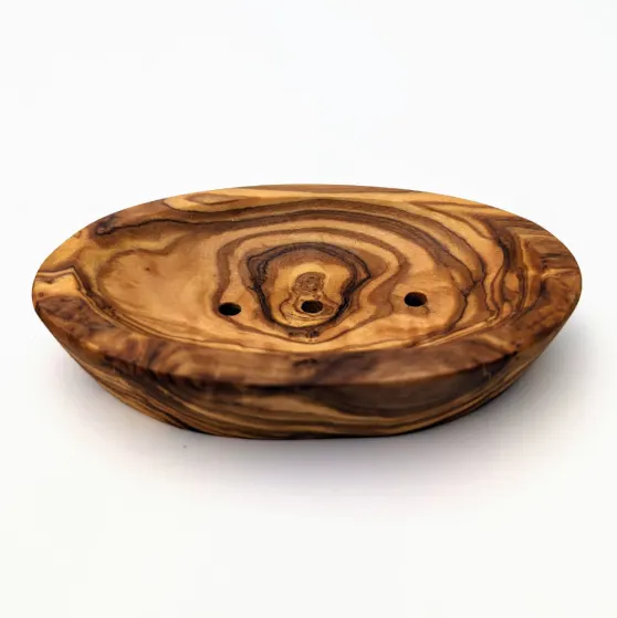 Zeepbakje van olijfhout met drie gaatjes, waardoor het water goed weg kan. Gemaakt uit één stuk olijfhout. Door de hardheid van olijfhout en het hoge oliegehalte is het zeepbakje extreem goed bestand tegen vocht.