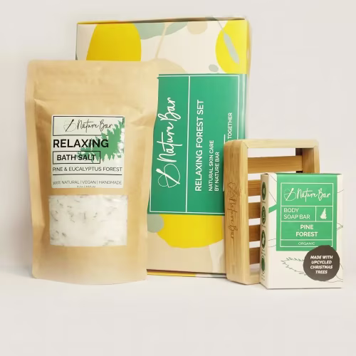 Inclusief de naaldboom boszeep (100 gr), gemaakt van geredde kerstbomen, bamboe zeepbakje zorgt ervoor dat de zeep bar langer meegaat en natuurlijk badzout (200 gr) voor een heerlijke ontspannen ervaring.