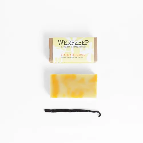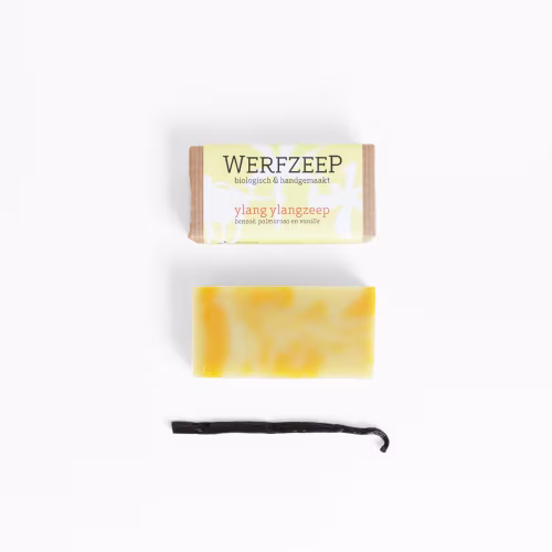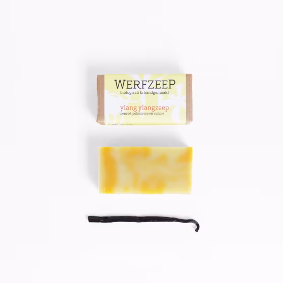 Ylang ylangzeep bevat etherische bloemenoliën en absolue van de heerlijke, vanille-achtig geurende hars van benzoë. Speciaal voor ylang ylangzeep macereren we heerlijk stroperige biologische vanillestokjes, dat zie je soms terug aan de zwevende stipjes in je zeep.