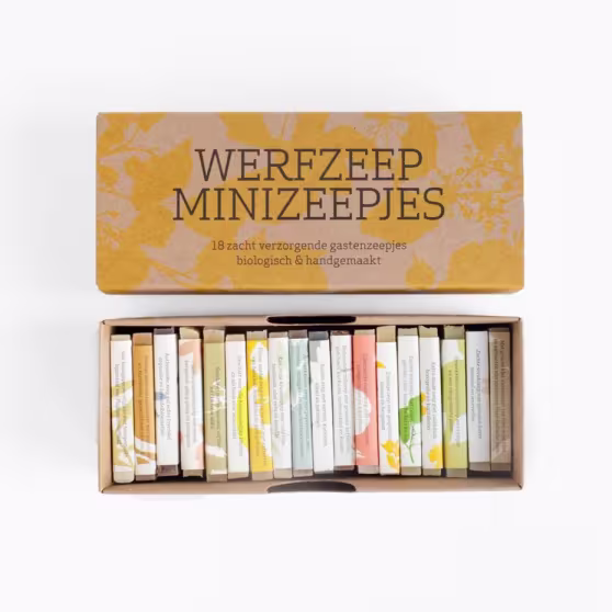 Speciaal voor deze schuifdoos heeft Werfzeep 18 van zepen geselecteerd. Zo kun je verschillende douchezepen proberen, maar ook de scrubzepen, shampoo en schoonmaakzeep. Allemaal zijn ze heerlijk verzorgend, volledig plantaardig, biologisch en handgemaakt.